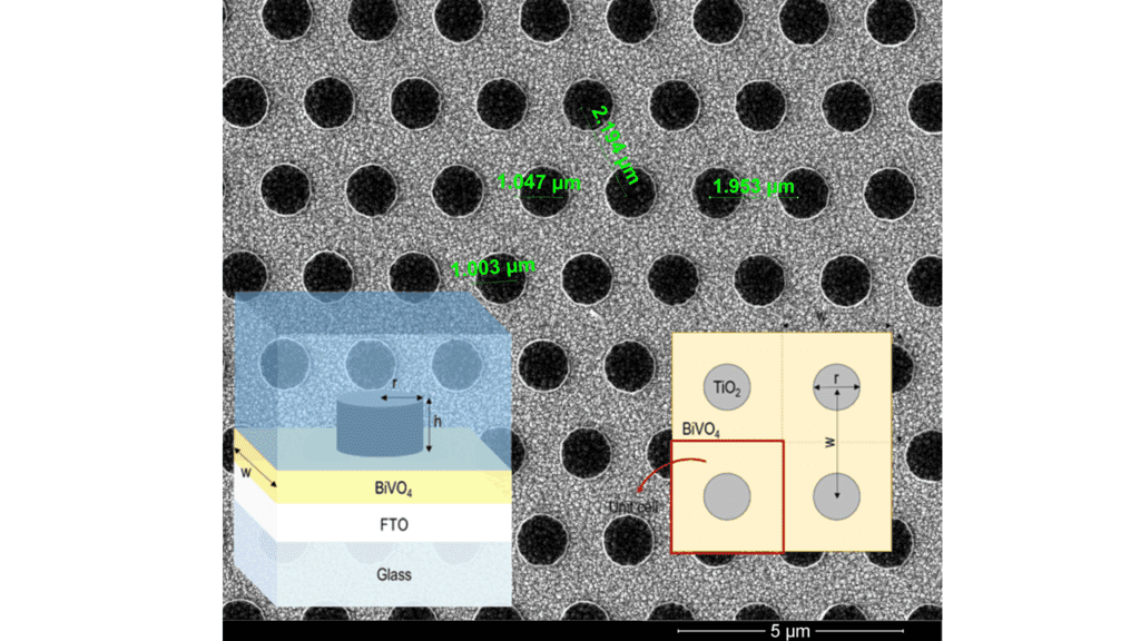 Estructures fotòniques de 1, 2 o 3 dimensions que formen cavitats òptiques i/o dispersen la llum, propiciant la absorció òptima de la llum solar en dispositives PEC generadors de hidrogen, balancejant els valors de voltatge i densitat de corrent. La incorporació de nano-estructures fotòniques 3D (e.g. cilindres de TiO2 sobre un fotoànode de BiVO4) i/o 1D (e.g. capes primes intercalades de materials amb distint índex de refracció) en PECs d’H2 poden incrementar els corrents de curtcircuit fins a un 350%, millorant la viabilitat tècnica i econòmica de la tecnologia PEC en general.